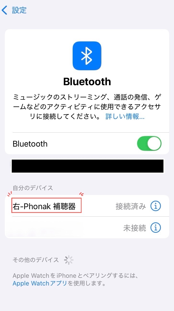 デバイス名『右PHONAK 補聴器』をタップする。