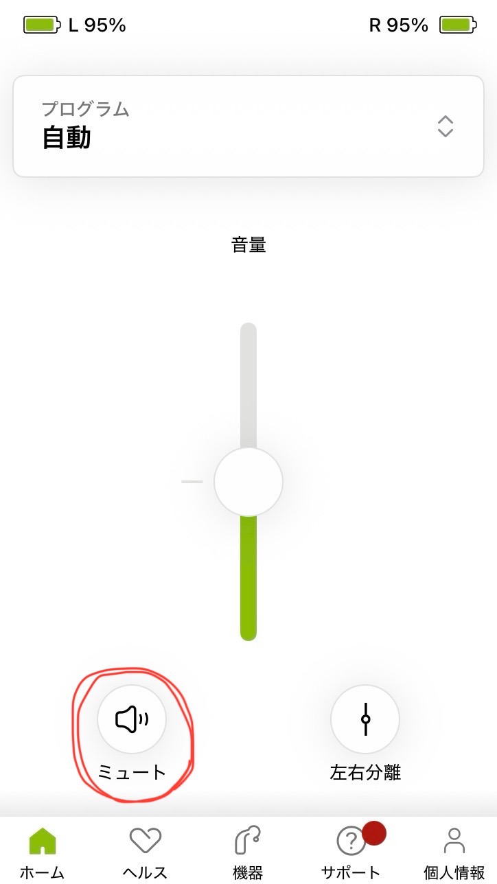 左下の「ミュート」をタップすると、補聴器のマイクがオフになります。