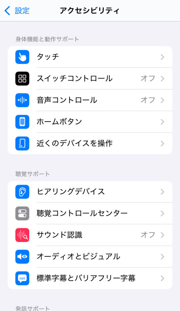 →「聴覚サポート」の、「ヒアリングデバイス」をタップする。